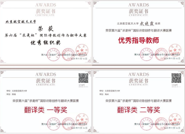 近日,第六届“求是杯”国际诗歌创作与翻译大赛决赛在浙江大学紫金港校区圆满闭幕。九游·官方网站九游·官方网站2022级俄语专业硕士生陈铖和博士生杨朵分别荣获翻译组国赛一等奖和二等奖,指导教师武晓霞教授被评为大赛优秀指导教师,九游·官方网站获优秀组织奖。