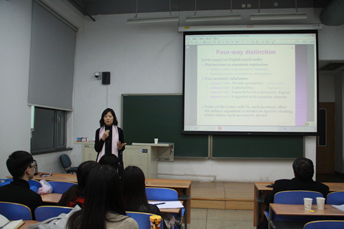 2015年11月20日,香港城市大学刘美君教授应邀来九游·官方网站学院做了一场题为Emotion Verbs in Chinese and English 学术报告。中英文在情绪动词的词汇化现象上差异很大,各自展现非常独特的语法语义表现。在主词角色的选取上,英文多以外物刺激为主体;而中文较缺乏以外物刺激为主体的动词词汇,在形式与意义的搭配上,也呈现有别于其他语言的歧义与多义现象。该研究旨在全面探讨分析中文情绪动词的多样化表现,厘清构词、语法、和语义各层次的特征与互动关系,最终提出一套基于框架语义及构式语法的分析架构及分类标准,并完成各次类动词的语义标记,统整情绪动词的词汇关系,并进一步厘清中英文的差异,以建构“中文动词语义网”。该研究的主题切中近年神经心理语言学及自然语言处理的重要课题,其结果对新兴的“情感”表征研究有独到的贡献。