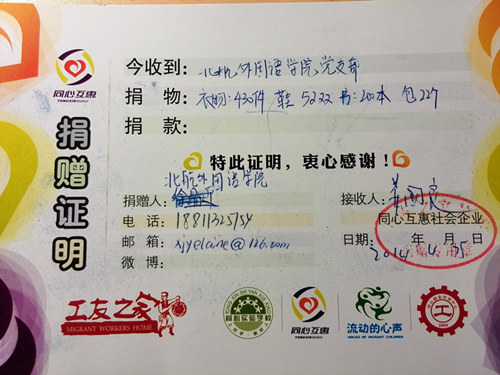 外院的同学们积极踊跃参与到献爱心的行列中来,据统计,本次活动共收集衣服430件,鞋子52双,书本200本,书包22个。全部物品赠予“同心互惠”公益商店,“同心互惠”工作人员向同学们表达了诚挚的感谢。
